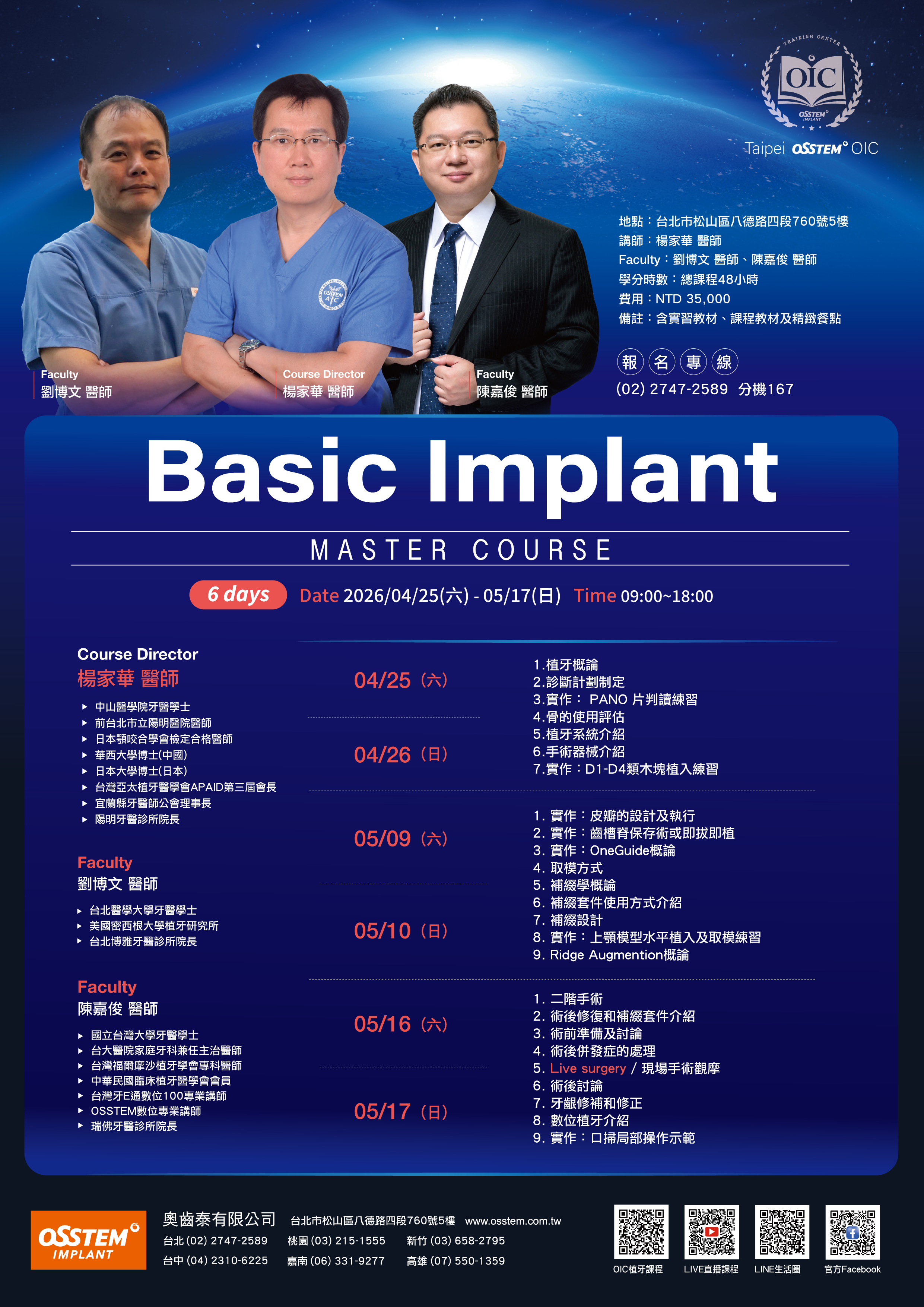 備註(二):牙醫系在校學生 及 院所實習醫師 另有優惠 (課程費用:$17,000元、不含Live Surgery及學分),線上報名後,待業務聯繫時再請告知業務人員即可。